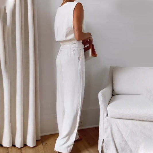 🔥2025 HEISSER VERKAUF🔥Ärmelloses plissiertes Oberteil mit V-Ausschnitt und weit geschnittene Hose